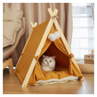Solid Wood Cat Indoor Tent with Thick Mat,Cute Cat Teepee Cave Cat Bed